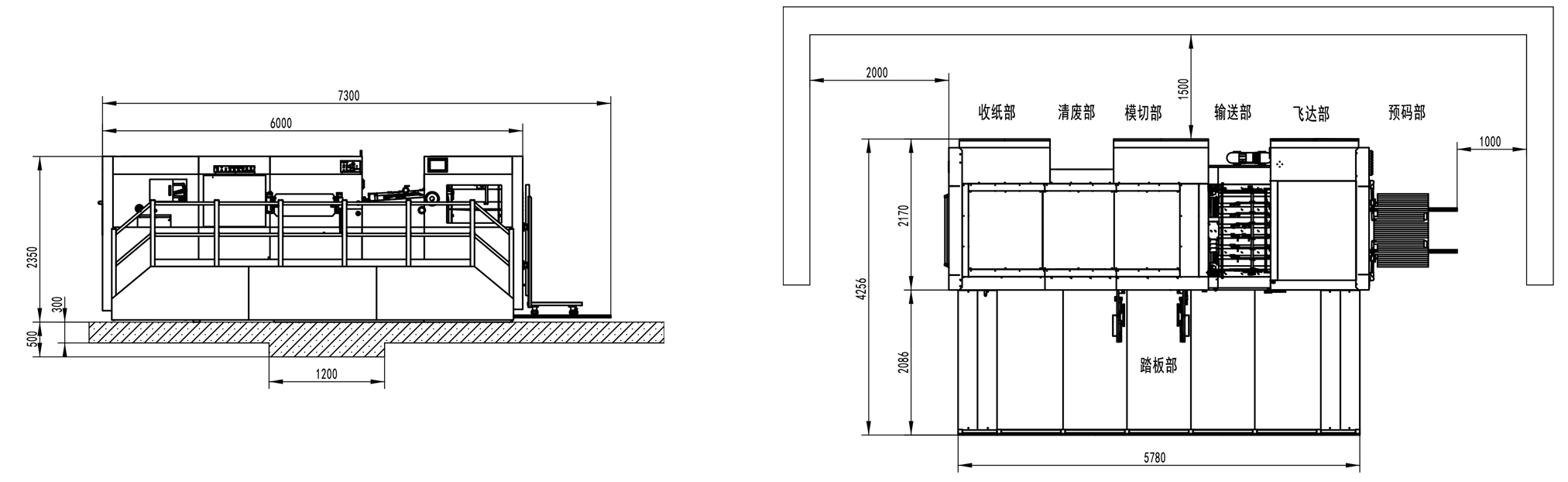 | 整機(jī)尺寸 | 7300×4256×2350mm(L×W×H) (長含預(yù)上紙軌道;寬含腳踏板) |