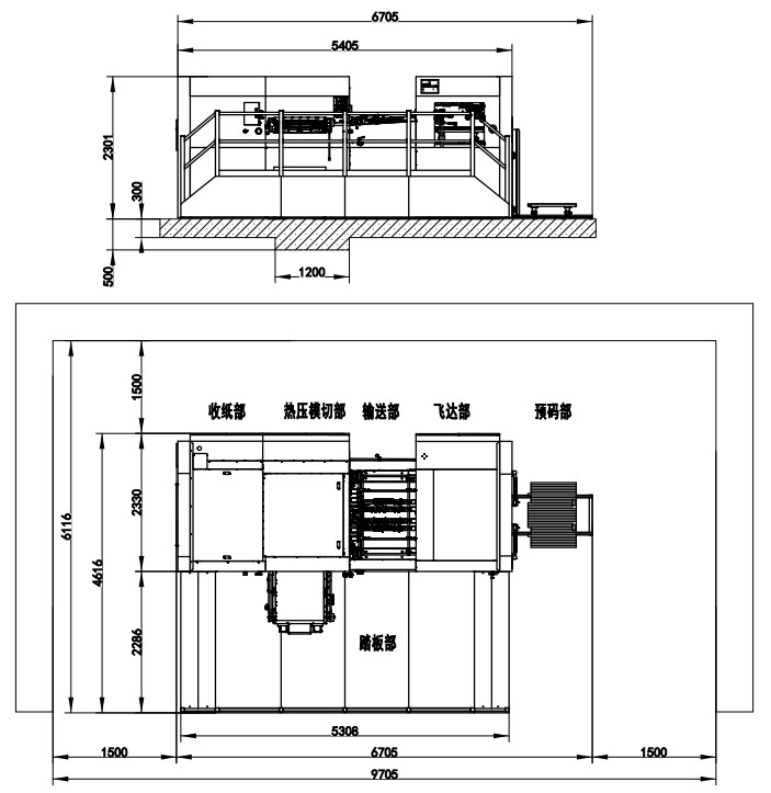 | Machine Dimensions (Including Die Preloader) | 6705×5516×2301mm (L×W×H)(L:paper prepared track included, W:platform included) |